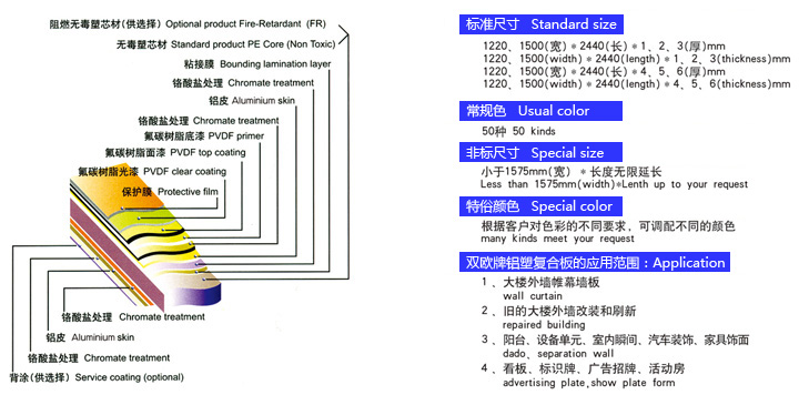 应用在幕墙、外墙装饰、钢结构、展馆、机场、车站、车辆、航空,柱梁、阳台、机箱柜体、室内装饰、广告牌、车厢、家具、展台、仪器外壳、仪表板等。