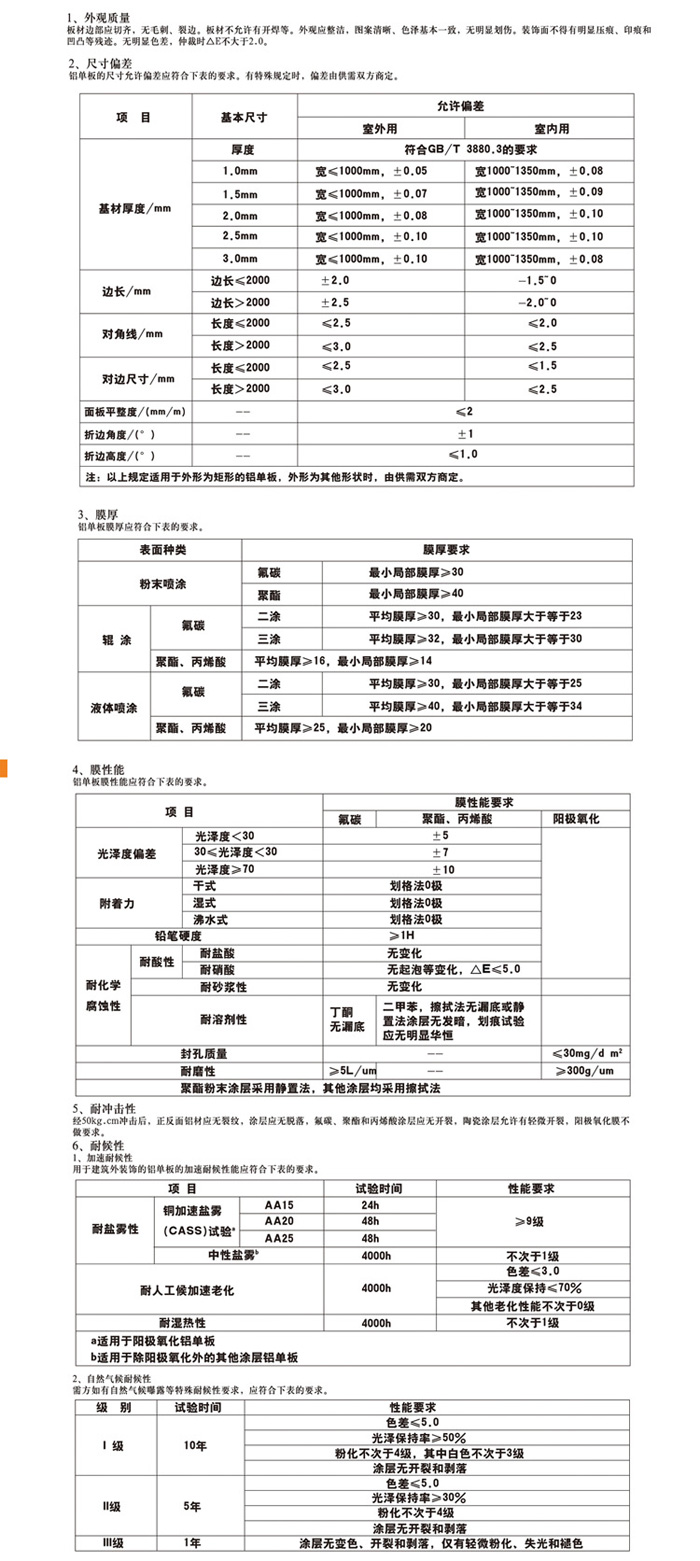 内装铝板按形状可分为常规家装板300mm*300mm、工程板600mm*600mm和异型板,能够制作各种形状和造型。铝板厚度按板面尺寸大小来选择,一般在0.5mm~2.0mm之间。